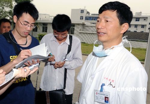 6月1日,福州市肺科醫(yī)院副院長林鐘軒(右)在接受記者采訪時表示:福建省第四例甲型H1N1流感患者經(jīng)過治療目前病情有所好轉(zhuǎn)。該患者,男,22歲,美國籍,在美國一企業(yè)工作。5月26日從紐約乘機(jī)經(jīng)溫哥華至香港,在香港轉(zhuǎn)乘KA660航班,北京時間28日上午抵達(dá)福州長樂國際機(jī)場。30日上午因發(fā)熱、咳嗽就診連江縣琯頭衛(wèi)生院,測體溫38.3℃。31日凌晨轉(zhuǎn)至福州肺科醫(yī)院隔離治療,入院測體溫39.3℃,伴咳嗽、頭痛、咽痛等流感樣癥狀。30日晚上福州市疾病預(yù)防控制中心對患者鼻咽拭子標(biāo)本進(jìn)行了檢測,結(jié)果為甲型H1N1流感病毒核酸陽性。省衛(wèi)生廳專家組根據(jù)患者的臨床表現(xiàn)、流行病學(xué)史和實(shí)驗(yàn)室檢測結(jié)果,按照衛(wèi)生部制定的診療方案,判定該病例為甲型H1N1流感確診病例。相關(guān)情況已經(jīng)報告衛(wèi)生部。中新社發(fā) 劉可耕 攝