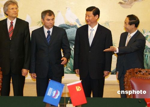 6月2日下午,中聯(lián)部部長王家瑞(右一)在北京人民大會堂與俄羅斯“統(tǒng)俄黨”總委會主席團書記、俄羅斯國家杜馬副主席維·沃洛金(左二)簽署《中國共產(chǎn)黨與統(tǒng)一俄羅斯黨合作協(xié)議》、《中國共產(chǎn)黨與統(tǒng)一俄羅斯黨2009-2011年合作備忘錄》兩項協(xié)議。中共中央政治局常委、國家副主席習近平(右二)出席簽字儀式。中新社發(fā) 任晨鳴 攝