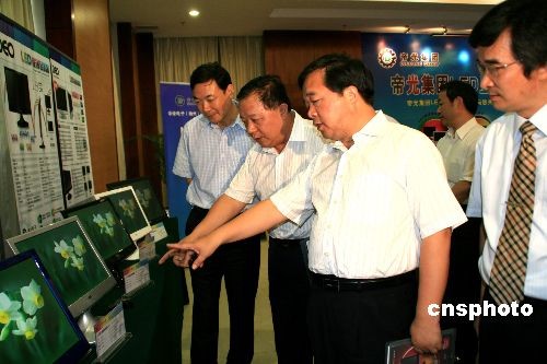 7月20日上午,揚州舉行由某集團自主研發(fā)的LED顯示終端系列產(chǎn)品發(fā)布會并現(xiàn)場進行展示,凸顯LED終端顯示應用產(chǎn)品在健康、節(jié)能、環(huán)保和超薄、時尚等方面超前的理念。揚州市委書記季建業(yè)、市長王燕文等出席。季建業(yè)(右二)表示,揚州要著力推動綠色新能源產(chǎn)業(yè)的技術(shù)向高端突破,產(chǎn)品向終端延伸,推出“五個一”計劃,即1000萬臺LED顯示器、1000萬臺LED電視機、1000萬臺一體化筆記本電腦、1億盞LED燈、1億本E-book。到2012年,新能源、新光源產(chǎn)業(yè)實現(xiàn)產(chǎn)值“雙千億”。中新社發(fā) 崔佳明 攝