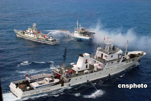 “中越北部灣漁業(yè)合作協(xié)定實(shí)施五周年聯(lián)合監(jiān)管巡航啟航儀式”,6月30日分別在海南三亞、廣西北海和廣東雷州同時(shí)舉行,十二艘艦艇參與。漁政、海警隨后在三亞海域聯(lián)合演練,本次演練出動(dòng)艦艇七艘、直升飛機(jī)一架。演練包括單縱隊(duì)演練、梯隊(duì)演練、救助演練。圖為救助演練。中新社發(fā) 白玉 攝