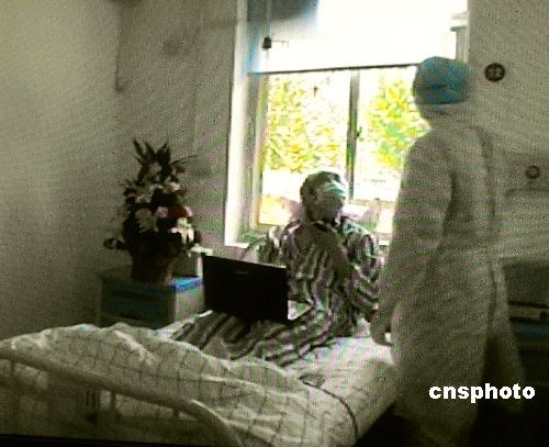 五月十三日中午,在山東省城濟(jì)南市傳染病醫(yī)院接受治療的輸入性甲型H1N1流感疑似患者呂某某目前身體、精神各情況已基本恢復(fù)。疑似患者呂某某在十一日晚剛從濟(jì)南火車(chē)站下車(chē)時(shí)體溫一度高達(dá)三十八點(diǎn)九攝氏度。經(jīng)過(guò)濟(jì)南市傳染病醫(yī)院的醫(yī)護(hù)治療,體溫已降至三十六點(diǎn)七攝氏度。圖為記者從醫(yī)院監(jiān)控系統(tǒng)的電視屏幕上拍到的患者正在與醫(yī)生交談。中新社發(fā) 張璐 攝