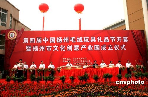 5月18日上午,“第四屆中國揚(yáng)州毛絨玩具禮品節(jié)在五亭龍國際玩具禮品城開幕,舉行揚(yáng)州市文化創(chuàng)意產(chǎn)業(yè)園成立、揚(yáng)州市五亭龍國際玩具精品館開館儀式,同時(shí)啟動(dòng)揚(yáng)州市文化創(chuàng)意產(chǎn)業(yè)聯(lián)盟。中國禮儀用品工業(yè)協(xié)會(huì)副理事長、秘書長曾會(huì)師,揚(yáng)州副市長王玉新,維揚(yáng)區(qū)委書記姚蘇華等領(lǐng)導(dǎo)和來自海內(nèi)外數(shù)百名玩具采購商參加,開幕式由維揚(yáng)區(qū)長楊蓉主持。中新社發(fā) 崔佳明 攝