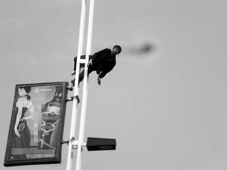 5月16日14時(shí)45分,許昌市(河南)消防支隊(duì)禹州大隊(duì)接到報(bào)警,位于禹州市濱河路東段歐蔓咖啡廳對(duì)面一路燈桿上有人要自殺。消防官兵趕到現(xiàn)場(chǎng)發(fā)現(xiàn),一名約40歲左右,操外地口音的男子在路燈桿頂部,一會(huì)兒躺在路燈桿頂部的燈罩架上做出睡覺(jué)姿勢(shì),一會(huì)兒抓住燈罩架蕩起“秋千”。