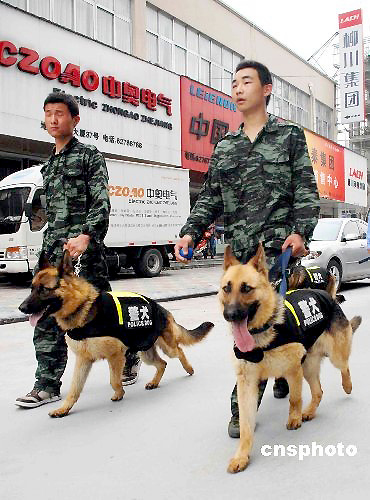 近日,浙江溫州市樂(lè)清公安局首次將警犬投入到社會(huì)治安管理中。首批4條警犬分為兩組:一組負(fù)責(zé)樂(lè)清柳市車站周邊的巡邏,另一組配合警方設(shè)卡和對(duì)可疑人員的追蹤、圍堵。2009年4月份,樂(lè)清警方專門(mén)成立了警犬基地,由保安公司負(fù)責(zé)飼養(yǎng)與日常管理。目前,警犬基地已從南京軍區(qū)購(gòu)買20只警犬,每只身價(jià)都在萬(wàn)元以上,多為體型強(qiáng)壯勻稱、勇敢無(wú)畏的德國(guó)牧羊犬。據(jù)介紹,這20只護(hù)衛(wèi)犬主要用于溫州樂(lè)清的警戒、巡邏等,其中4只首批受訓(xùn)成功投入使用。中新社發(fā) 許勛磊 攝