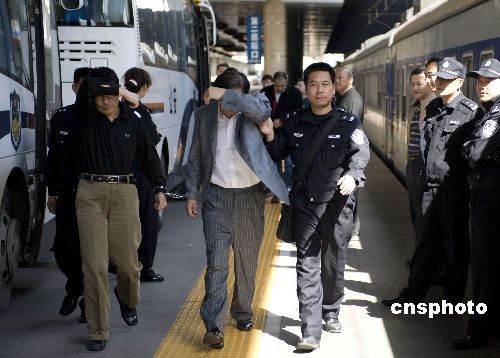 廣西南寧一名人稱(chēng)傳銷(xiāo)業(yè)“教授”的何姓老漢,因組織在南寧市從事傳銷(xiāo)的140多名外省籍傳銷(xiāo)人員到北京參加所謂的“第二屆群英會(huì)暨振興民族經(jīng)濟(jì)杰出華人高峰論壇”,被南寧警方抓獲。日前,“何教授”等4名主要犯罪嫌疑人已被南寧市青秀區(qū)人民檢察院以組織、領(lǐng)導(dǎo)非法傳銷(xiāo)罪批準(zhǔn)逮捕。圖為南寧市經(jīng)濟(jì)犯罪偵查支隊(duì)民警將“何教授”等人從京押解回南寧。中新社發(fā) 韋強(qiáng) 攝