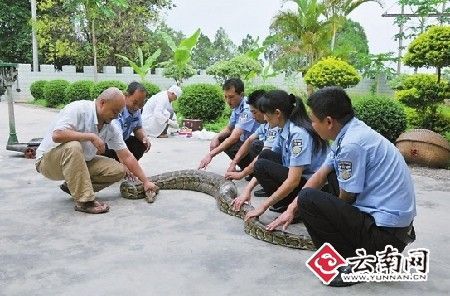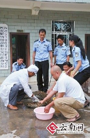 幫巨蟒清洗完身體后,民警當(dāng)場為其體檢:身長3.7米,腹圍粗為55厘米,重達(dá)25公斤。經(jīng)西雙版納傣族自治州林業(yè)局野生動(dòng)物保護(hù)站獸醫(yī)師許定澤鑒定,這條巨蟒屬于國家一級保護(hù)野生動(dòng)物的雌性金花蟒,年齡約20歲左右。根據(jù)蟒蛇約35歲左右的壽命推算,其應(yīng)該正處于盛年期。據(jù)許定澤介紹,這樣大的金花蟒,實(shí)屬罕見。(戴振華 常宗波)
