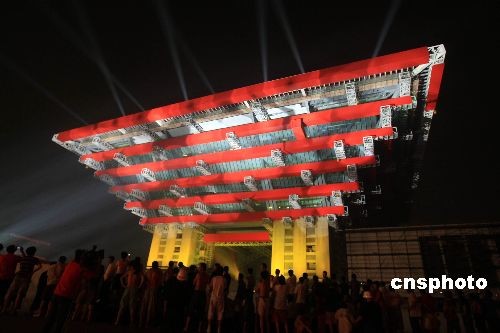 6月22日晚,素有“東方之冠”之稱(chēng)的上海世博會(huì)中國(guó)館舉行亮燈儀式,在黃浦江畔初綻美麗光芒。中國(guó)館正式亮燈是世博會(huì)園區(qū)電力建設(shè)中一個(gè)重要里程碑,標(biāo)志著世博各項(xiàng)供電工程已全面進(jìn)入沖刺階段。據(jù)悉,今日投運(yùn)的中國(guó)館三十五千伏變電站總?cè)萘繛橐稽c(diǎn)六萬(wàn)千伏安,投運(yùn)后將直接為兩萬(wàn)平方米的中國(guó)國(guó)家館、三萬(wàn)平方米的中國(guó)地區(qū)館以及三千平方米的港澳臺(tái)館提供安全、穩(wěn)定的電力。中新社發(fā) 湯彥俊 攝