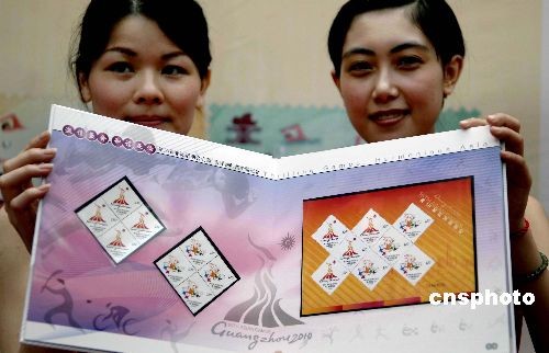 6月30日,在廣州亞運(yùn)會(huì)倒計(jì)時(shí)500天之際,由第16屆亞運(yùn)會(huì)組委會(huì)授權(quán)、中國(guó)郵政發(fā)行的廣州亞運(yùn)會(huì)首套紀(jì)念郵票《第16屆亞洲運(yùn)動(dòng)會(huì)》在廣州舉行首發(fā)儀式。該套紀(jì)念郵票共兩枚,圖案分別為廣州亞運(yùn)會(huì)的會(huì)徽和吉祥物,采用五色影寫(xiě)版印刷方式,由中國(guó)著名郵票設(shè)計(jì)家方軍設(shè)計(jì),畫(huà)面將嶺南文化元素與亞運(yùn)元素融為一體,具濃郁嶺南氣息。中新社發(fā) 劉衛(wèi)勇 攝