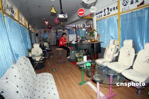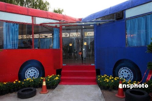 6月30日,河南許昌9名車(chē)友出資20萬(wàn)元在該市文昌宮院內(nèi)按照公交車(chē)的形狀自己動(dòng)手制作了一個(gè)別具特色的“汽車(chē)酒吧”,酒吧內(nèi)部利用廢舊汽車(chē)配件進(jìn)行裝飾,面積90多平方米,可同時(shí)容納40多人使用,給人帶來(lái)一種汽車(chē)文化的時(shí)尚享受。中新社發(fā) 牛書(shū)培 攝