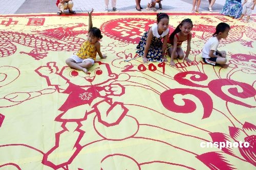 2009年7月5日,濟(jì)南剪紙藝術(shù)院的工作人員和市民在濟(jì)南市泉城廣場展示巨幅剪紙作品。當(dāng)天是第十一屆全運(yùn)會倒計(jì)時100天,濟(jì)南剪紙藝術(shù)院的120多名藝人耗時6個月,共同創(chuàng)作完成巨幅剪紙作品。據(jù)了解,該作品總面積61.6平方米,長11米(寓意第十一屆全運(yùn)會),寬5.6米(寓意56個民族),主題為和諧中國、全民全運(yùn)。作品中的圖案包含十一全運(yùn)會標(biāo)志、吉祥物泰山童子、荷花(濟(jì)南市花)、泉水等。中新社發(fā) 龔輝 攝