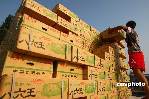 7月24日,新疆特產(chǎn)哈密瓜在北京新發(fā)地農(nóng)貿(mào)市場(chǎng)熱銷。時(shí)至盛夏,新疆的各色水果正陸續(xù)成熟,在當(dāng)?shù)毓r(nóng)喜迎豐收的同時(shí),相關(guān)政府部門采取措施幫助他們打開銷路。7月21日,國(guó)家商務(wù)部和新疆維吾爾自治區(qū)政府在烏魯木齊組織召開“新疆農(nóng)產(chǎn)品產(chǎn)銷對(duì)接洽談會(huì)”,來自廣東、北京等地的19家大型農(nóng)產(chǎn)品批發(fā)零售企業(yè)與當(dāng)?shù)毓⿷?yīng)商及生產(chǎn)基地簽訂近40萬噸的采購協(xié)議。中新社發(fā) 富田 攝