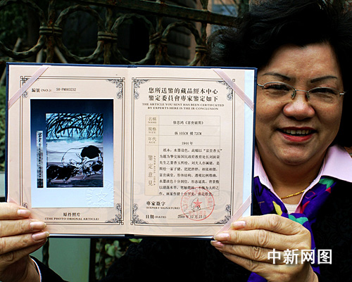 在2009年12月底,這幅畫送權(quán)威機構(gòu)北京中博文物檢測鑒定中心鑒定,經(jīng)資深文物鑒定專家陳行一先生鑒定,確認(rèn)為徐悲鴻大師的真跡。陳行一在鑒定意見中還寫道:“劉夫人亦屬豬,是圖繪一家子豬,肥肥胖胖,相依相偎,富貴滿堂。形體結(jié)構(gòu)、透視比例準(zhǔn)確,水墨淡色十分到位,形態(tài)逼真。背景敷以湖蕩水草,筆觸簡練,不愧為大師之作。畫家作豬十分罕見,彌足珍貴!