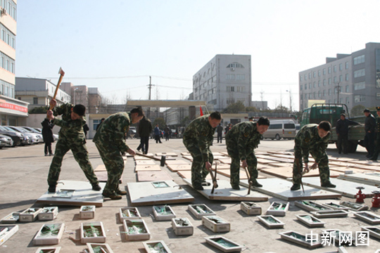 中新網(wǎng)連云港3月10日電 (蘇欣 吳茂新 朱曉穎)10日上午,在連云港市消防支隊營區(qū)院內,由消防部門聯(lián)合工商、質監(jiān)共同查獲的不合格滅火器、消火栓、消防應急照明燈等520余件消防假冒偽劣產(chǎn)品被集中銷毀。