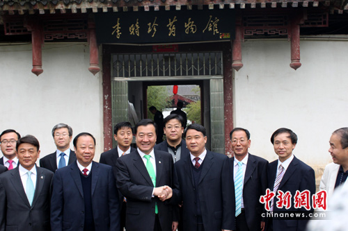4月26日,經(jīng)過韓國(guó)明星張娜拉牽線搭橋,韓國(guó)堤川市市長(zhǎng)嚴(yán)泰永一行15人赴中國(guó)“醫(yī)圣”李時(shí)珍故里——湖北蘄春縣參觀訪問。韓國(guó)堤川市代表團(tuán)參訪了蘄春縣的李時(shí)珍國(guó)際健康文化旅游區(qū)、李時(shí)珍紀(jì)念館、李時(shí)珍國(guó)際醫(yī)藥港、李時(shí)珍醫(yī)藥集團(tuán)等景區(qū)、企業(yè)。