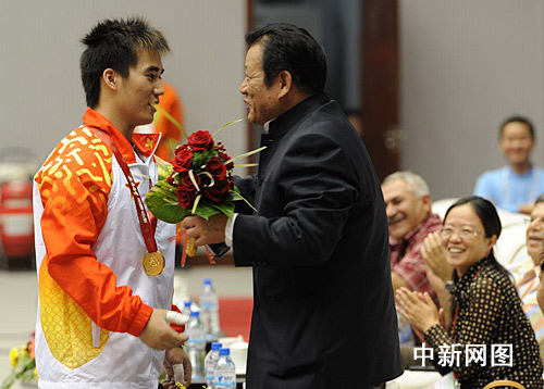中新網(wǎng)10月24日晚濟(jì)南電(作者 王勇)24日晚舉行的十一運(yùn)男子77公斤舉重比賽頒獎(jiǎng)儀式中,發(fā)生了感人的一幕。以總成績374公斤打破全國紀(jì)錄并獲得冠軍的解放軍選手蘇達(dá)金,在接受鮮花后立刻沖下獎(jiǎng)臺,奔向坐在嘉賓席上的國家體育局摔柔運(yùn)動(dòng)管理中心主任馬文廣先生,向老師獻(xiàn)花表達(dá)謝意。