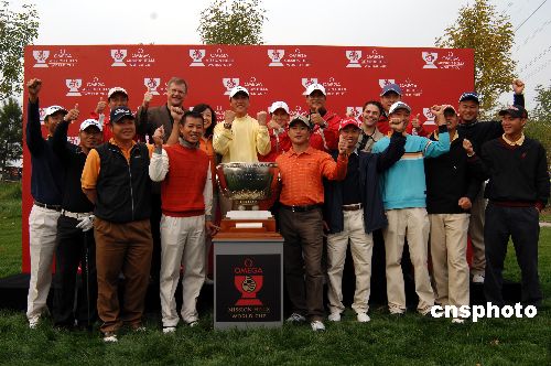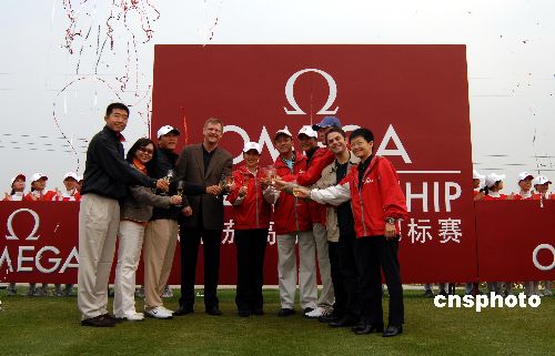 2007歐米茄中國巡回賽年度收官之站——歐米茄高爾夫球錦標賽于10月18日至21日在北京天安假日運動俱樂部舉行,本站賽事獎金總額80萬人民。10月17日,國家體育總局小球中心副主任王立偉、歐米茄大中華區(qū)總裁盧克勤、歐米茄名人大使楊揚、任達華,天安假日運動俱樂部董事程軍、歐米茄中國巡回賽球員張連偉共同出席開球儀式。中新社發(fā) 楊可佳 攝
