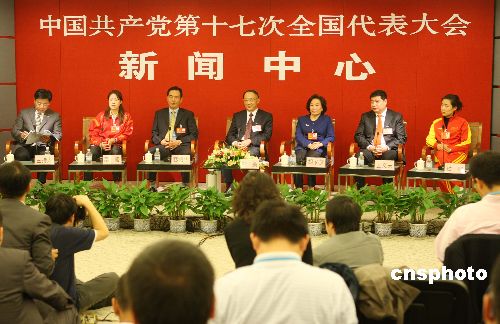 十月十七日,出席中共十七大的國(guó)家體育總局代表劉鵬、胡家燕、蔡振華、王義夫、高凌、杜麗在北京梅地亞中心接受中外媒體采訪(fǎng)。中新社發(fā) 毛建軍 攝