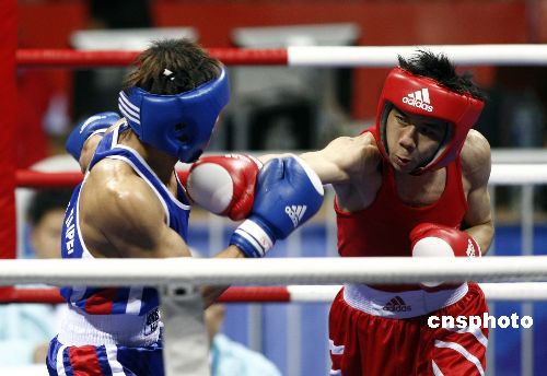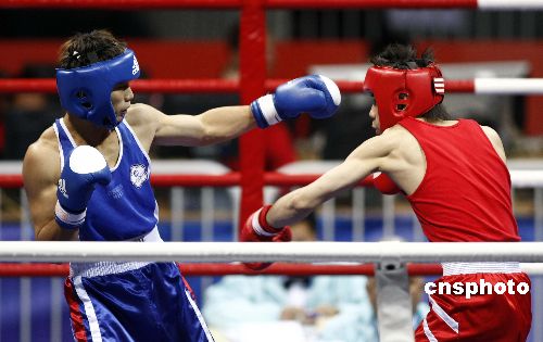 十一月十八日晚,“好運北京”2007年國際拳擊邀請賽在北京工人體育館進行預賽第三階段的比賽,在男子五十七公斤級的比賽中,中國香港選手曹聲揚(紅色)在比賽中進攻雖猛仍不敵中華臺北選手鐘俊安(藍色)。本次邀請賽有來自十七個國家和地區(qū)的十八支隊伍參加,采用單敗淘汰制方式,進行預賽、半決賽、決賽共七十場比賽,比賽時間為十一月十七日至二十二日。中新社發(fā) 盛佳鵬 攝