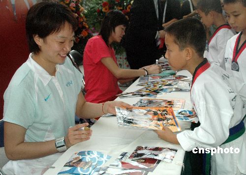12月12日,前來三亞參加2007“蘭海杯”第三屆中韓跆拳道對抗賽的奧運冠軍陳中、羅薇,在三亞“美麗之冠”進行簽贈活動,受到許多跆拳道愛好者的熱烈歡迎。中新社發(fā) 尹海明 攝