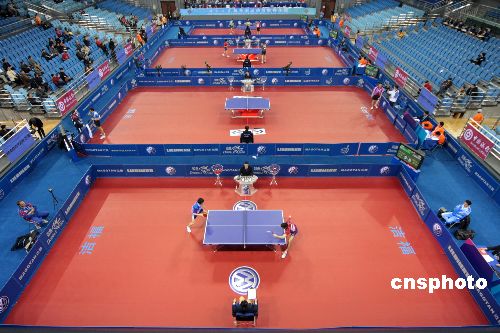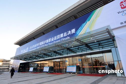 12月13日,新近落成的北京大學(xué)奧運(yùn)乒乓球館迎來“好運(yùn)北京”2007年ITTF職業(yè)巡回賽總決賽。奧運(yùn)乒乓球館可提供固定與活動(dòng)座位共7557座,其中位于首層的比賽場(chǎng)地長(zhǎng)47米,寬39.5米,最多可布置8張乒乓球臺(tái)同時(shí)進(jìn)行比賽。放入活動(dòng)座椅后,賽場(chǎng)變?yōu)殚L(zhǎng)27米,寬20米,可放置2張乒乓球臺(tái)進(jìn)行比賽。中新社發(fā) 吳芒子 攝