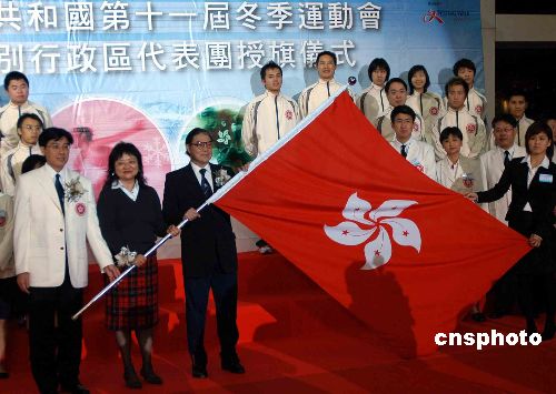十二月十九日,中華人民共和國第十一屆冬季運(yùn)動會香港特別行政區(qū)代表團(tuán)授旗儀式在又一城歡天雪地溜冰場舉行。民政事務(wù)局常任秘書長尤曾家麗授旗予代表團(tuán)。其它主禮嘉賓包括香港特別行政區(qū)代表團(tuán)籌備委員會主席霍震霆和籌備委員會副主席、康樂及文化事務(wù)署署長周達(dá)明。第十一屆冬季運(yùn)動會將于明年一月十八日至二十八日在黑龍江省齊齊哈爾市舉行。中新社發(fā) 譚達(dá)明 攝
