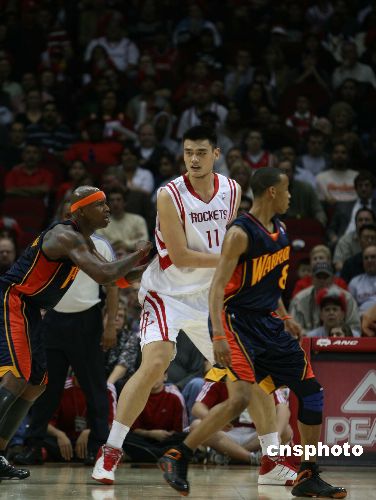 休斯頓火箭隊三十一日晚在主場豐田體育中心以九十五比一百一十二負(fù)于來訪的金州勇士隊。姚明在比賽中僅有八次出手,得到了十六分。阿爾斯通拿下火箭隊當(dāng)晚最高的二十二分。圖為當(dāng)日的比賽。中新社發(fā) 楊晉生 攝