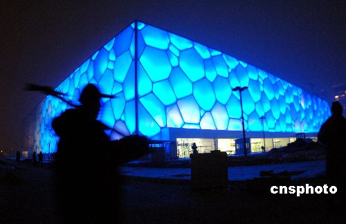 一月十八日,北京奧運游泳館——“水立方”開始調試造型燈光,“水立方”中每個氣泡被照射上藍色燈光,令人暢想奧運水世界。據悉,一月三十一日這里將舉行奧運測試賽,屆時“水立方”將被照射更多的彩色燈光。中新社發(fā) 廖攀 攝