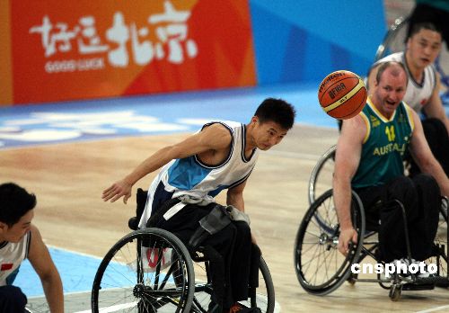 好運(yùn)北京-2008國(guó)際輪椅籃球邀請(qǐng)賽,1月20日在北京奧運(yùn)會(huì)主要賽場(chǎng)-國(guó)家體育館舉行。此次賽事的主旨是全面檢測(cè)北京殘奧會(huì)比賽的各個(gè)環(huán)節(jié),北京殘奧會(huì)的輪椅籃球賽事就在該體育館舉行。圖為世界勁旅澳大利亞隊(duì)(綠)與中國(guó)隊(duì)在男子比賽中。中新社發(fā) 任晨鳴 攝