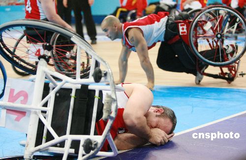 1月22日,“好運北京”2008年國際輪椅籃球邀請賽在北京國家體育館繼續(xù)進(jìn)行,在男子組最后一輪比賽中,雅典殘奧會冠軍加拿大隊以69比47戰(zhàn)勝中國隊。三輪循環(huán)賽過后,加拿大隊2勝1負(fù)很可能獲得預(yù)賽第二名,中國隊三戰(zhàn)皆負(fù)排名第四。圖為比賽中加拿大隊兩名隊員由于拼搶激烈摔倒在球場上。中新社發(fā) 廖文靜 攝