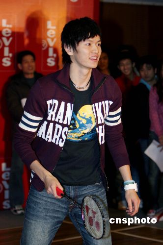 1月29日,北京某品牌服飾請(qǐng)來(lái)潮流天王陳冠希及內(nèi)地知名設(shè)計(jì)師樊小博分別設(shè)計(jì)限量Sports概念Tee。在發(fā)布會(huì)現(xiàn)場(chǎng),主辦方特別邀請(qǐng)了2008年奧運(yùn)金牌有力競(jìng)爭(zhēng)者——羽毛球國(guó)手鮑春來(lái)出席宣傳活動(dòng)。中新社發(fā) 袁方 攝