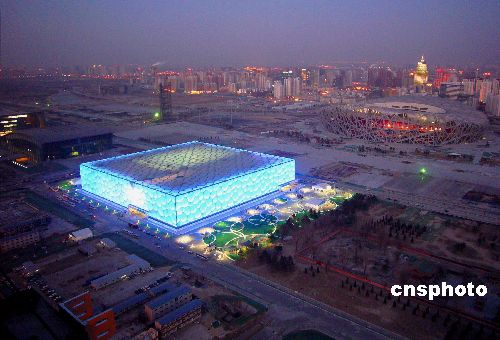 2008年1月31日傍晚,俯瞰“水立方”宛若一座美麗的“水晶宮” 晶瑩剔透,其冰清玉潔的芳姿令人陶醉。當日,好運北京測試賽在此拉開帷幕。中新社發(fā) 玉龍 攝
