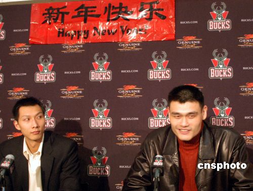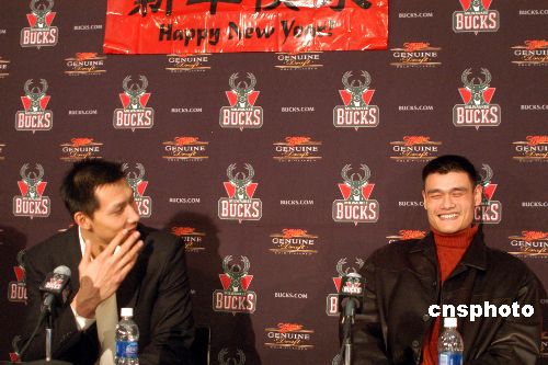 當?shù)貢r間二月二日,姚明率領(lǐng)休斯敦火箭隊作客密爾沃基布拉德利球館,最終火箭隊以九十一比八十三險勝另一名中國球員易建聯(lián)所在的雄鹿隊,獲得三連勝。賽后兩位“中國德比大戰(zhàn)”的主角在雄鹿隊特地安排的聯(lián)合記者會上談笑風生,一同向中國球迷致以新春祝福。中新社發(fā) 李靜 攝