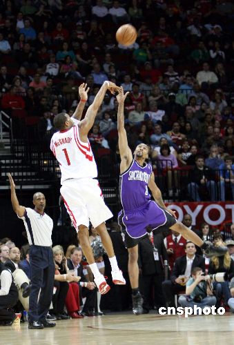 當(dāng)?shù)貢r間2月13日晚,火箭隊在大比分領(lǐng)先的情況下險些被國王隊翻盤,最終以89比87取得八連勝,姚明25分14個籃板取得兩雙。中新社發(fā) 楊晉升 攝