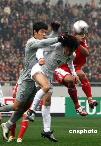 2月17日,2008東亞足球錦標(biāo)賽揭幕戰(zhàn)在中國(guó)重慶打響,中國(guó)男子足球隊(duì)(紅衣)仍未打破“恐韓”魔咒,終場(chǎng)前約兩分鐘被韓國(guó)隊(duì)攻入制勝一球,以2:3惜敗。中新社發(fā) 郭晉嘉 攝