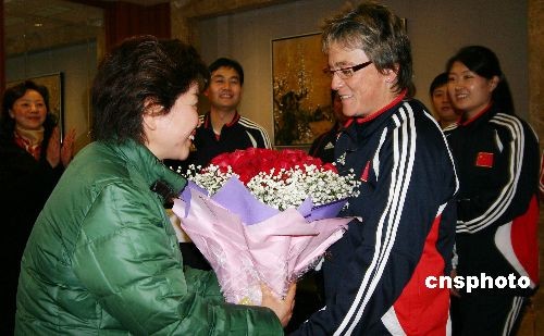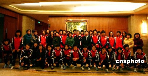 2月20日晚,重慶市婦聯(lián)主席蘭運(yùn)華一行代表全市1500萬婦女和球迷看望慰問中國女足的全體隊(duì)員和教練員,希望她們再創(chuàng)佳績。同時(shí)向姑娘們贈(zèng)送了鮮花、“鏗鏘玫瑰”書法、重慶特色的三峽碟畫等。中新社發(fā) 陳仕川 攝
