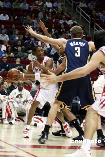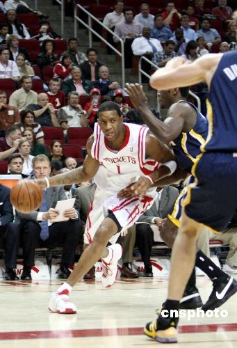 當(dāng)?shù)貢r(shí)間3月5日晚,休斯敦火箭隊(duì)坐鎮(zhèn)主場(chǎng),在缺少姚明的情況下,以117比99大勝印地安那步行者隊(duì)豪取16連勝,刷新了球隊(duì)41年歷史上的最長(zhǎng)連勝紀(jì)錄。圖為火箭靈魂人物麥迪帶球突破。中新社發(fā) 楊晉升 攝