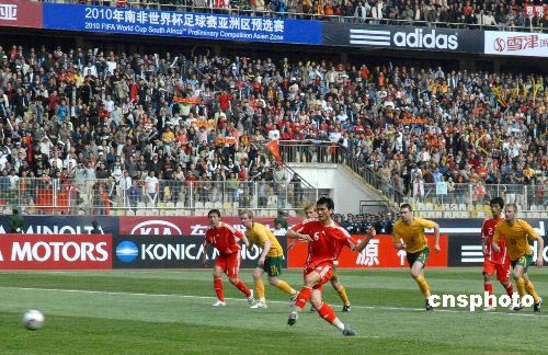 三月二十六日,中國(guó)男子足球隊(duì)與澳大利亞隊(duì)的世界杯預(yù)選賽在昆明拓東體育場(chǎng)舉行,在全場(chǎng)三萬兩千名觀眾的助威吶喊聲中,中國(guó)隊(duì)在主場(chǎng)得勢(shì)不得分,最終與澳大利亞隊(duì)零比零握手言和。中國(guó)隊(duì)邵佳一在臨近終場(chǎng)時(shí)罰失一個(gè)點(diǎn)球,成為本場(chǎng)比賽最大遺憾。圖為邵佳一罰失點(diǎn)球瞬間。中新社發(fā) 石雨 攝