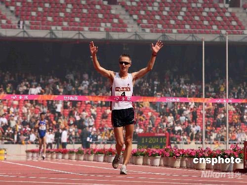 4月18日,國家體育場“鳥巢”迎來首場賽事,“好運(yùn)北京”2008國際田聯(lián)競走挑戰(zhàn)賽在此打響。在男子20公里競走比賽中,澳大利亞選手塔倫特以1小時(shí)20分11秒的成績摘得了“鳥巢”建成以來的首枚金牌。中新社發(fā) 富田 攝