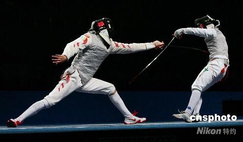 4月18日,“好運(yùn)北京”2008國(guó)際劍聯(lián)世界錦標(biāo)賽在國(guó)家會(huì)議中心擊劍館打響,首先進(jìn)行的是男子花劍團(tuán)體的比賽,在1/4決賽中,雅典奧運(yùn)會(huì)團(tuán)體金牌得主意大利隊(duì)(右)以45-33的比分戰(zhàn)勝了東道主中國(guó)隊(duì)(左),率先挺進(jìn)4強(qiáng)。中新社發(fā) 富田 攝