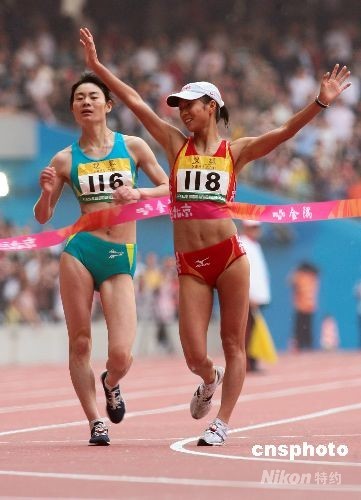 4月18日,好運(yùn)北京2008國際田聯(lián)競走挑戰(zhàn)賽在國家體育場“鳥巢”進(jìn)行,這是“鳥巢”建成以來舉辦的首場賽事,在當(dāng)天下午進(jìn)行的女子20公里競走比賽中,中國選手劉虹(右)以1小時29分33秒的成績摘得冠軍,這也是“鳥巢”投入使用后中國選手獲得的第一個冠軍。中新社發(fā) 富田 攝