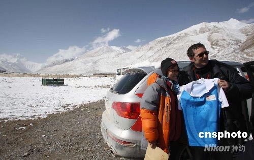 5月4日,由于身體原因,采訪北京奧運火炬接力珠峰傳遞活動的德國記者約克,不得不撤離珠峰大本營新聞中心,退出此次采訪活動返回德國。圖為約克(右)撤離前接受北京奧組委工作人員贈送的簽名襯衫。 中新社發(fā) 盛佳鵬 攝