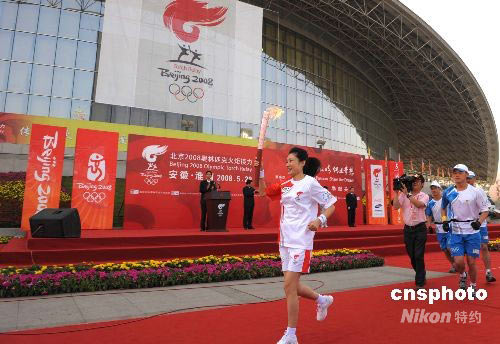 5月29日,奧運圣火在安徽淮南傳遞,中央電視臺主持人周濤領跑第一棒火炬。目前,周濤承擔北京奧運會和殘奧會全球電視轉播總協(xié)調工作。中新社發(fā) 廖攀 攝