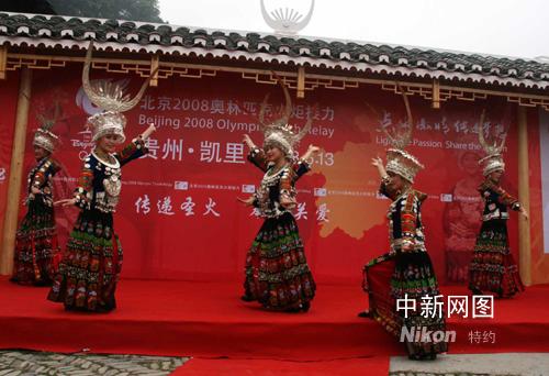 圖:苗族姑娘載歌載舞喜迎奧運火炬