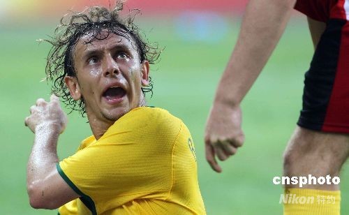 8月7日,北京奧運沈陽足球分賽場舉行男足預(yù)賽,巴西隊1:0勝比利時隊。圖為巴西球員RAFINHA怒對比利時犯規(guī)球員。中新社發(fā) 張宇 攝