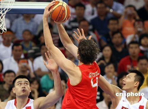 北京奧運會男子籃球小組賽第二輪賽事8月12日開始,首戰(zhàn)負于“夢八隊”的中國男籃在姚明率領(lǐng)下向世錦賽冠軍西班牙隊發(fā)起猛攻,在一路領(lǐng)先的大好局面下被西班牙隊在終場時扳平,經(jīng)過加時賽以75比85告負。中新社發(fā) 任晨鳴 攝