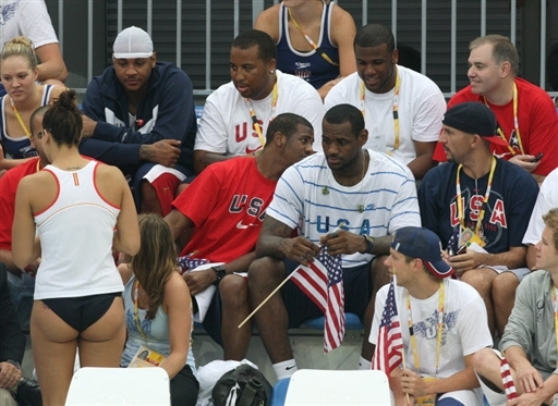 8月13日,科比,詹姆斯等美國男籃球星來到“水立方”觀看游泳比賽。