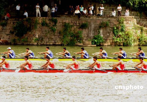 9月1日,2008海峽兩岸高校賽艇龍巖邀請賽在福建省龍巖上杭水上運(yùn)動中心舉行。來自北京大學(xué)、清華大學(xué)、臺灣輔仁大學(xué)、香港中文大學(xué)賽艇隊(duì),參加男子八人單槳有舵手賽艇競賽項(xiàng)目角逐。經(jīng)過激烈爭奪,清華大學(xué)、北京大學(xué)、臺灣輔仁大學(xué)、香港中文大學(xué)賽艇隊(duì)分獲前四名。中新社發(fā) 劉可耕 攝