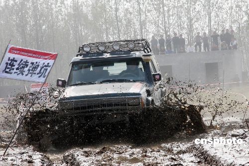 10月17日,2008華東地區(qū)汽車場(chǎng)地越野邀請(qǐng)賽決賽在安徽淮北市舉行。比賽分為男子、女子兩個(gè)組別,賽場(chǎng)設(shè)計(jì)了包括炮彈坑、深水池、蹺蹺板、沼澤地等18個(gè)障礙,來(lái)自華東地區(qū)百余頂尖車手、近60輛賽車齊聚淮北,各施絕技。中新社發(fā) 萬(wàn)善朝 攝