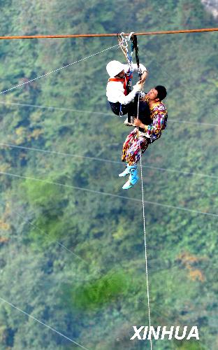 10月18日,新疆“達(dá)瓦孜”傳人賽買(mǎi)提·艾山在湖南張家界市天門(mén)山挑戰(zhàn)世界最大坡度高空走鋼絲時(shí)發(fā)生意外,在距終點(diǎn)50米處跌坐在鋼繩上,被迫放棄挑戰(zhàn)。意外發(fā)生后,地面安全人員及時(shí)展開(kāi)救援,歷時(shí)1小時(shí)16分鐘將懸坐在400米高空鋼繩上的賽買(mǎi)提順利救出。 新華社記者龍弘濤攝
