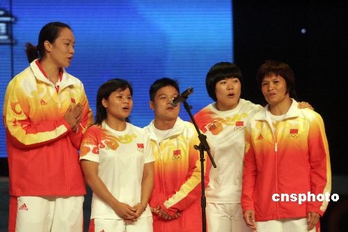 10月21日晚,贏得北京奧運會拳擊、跆拳道、舉重、柔道、摔跤等項目的奧運冠軍,包括張小平、鄒市明、陸永、陳燮霞、劉春紅、曹磊、王嬌、吳靜鈺、冼東妹、佟文、龍清泉、張湘祥、廖輝及前奧運會女子跆拳道冠軍陳中等14位奧運冠軍,參加“三亞城市精神評選暨奧運冠軍三亞行活動”晚會,為觀眾演唱歌曲《真心英雄》。中新社發(fā) 尹恩彪 攝